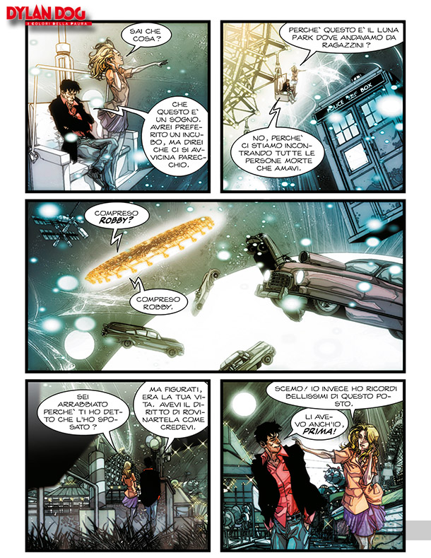 …e invece Paola e Carmine ci restituiscono un fumetto che è un atto di amore e rispetto nei confronti dell’originale, inseriscono la loro storia tra le righe di quella di Sclavi e tutto il “non detto”, che era il motore trainante della poetica de Il lungo addio, viene raccontato ma senza diventare esplicito o banale. Quanto affermato, però, potrebbe far immaginare una pedissequa riproposizione del numero 74 di Dylan Dog, magari condita da qualche astuto stratagemma narrativo. Invece non è così. Paola Barbato riesce a metterci un paio di “zampate d’autore” col pedigree. La prima è il tono generale del racconto che, pur rispettando l’atmosfera rarefatta e sognante del predecessore, risulta più “realistico e carnale” (mi perdonino gli autori ma non riesco a trovare un termine migliore). I tre baci tre tra Dylan e Marina sottolineano la passione e l’ardore adolescenziale del rapporto tra i due, che di fatto sembra essere la cosa più vicina all’Amore con la A maiuscola che l’Indagatore dell’Incubo abbia vissuto in quasi trenta anni di avventure. La seconda è un finale (che sarei crudele a rivelare) degno del miglior Sclavi: uno di quei finali che, quando chiudi l’albo, ti trovi con quel mezzo sorriso un po’ triste e un po’ felice.