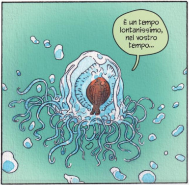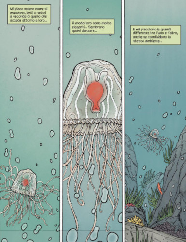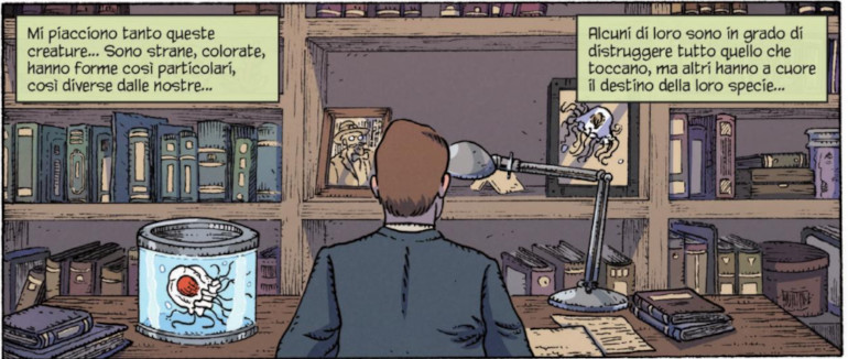 La narrazione di Diego Cajelli passa proprio attraverso la medusa che poi porterà il nome di Dohrn. L’espediente del contatto mentale con il grande biologo e corrispondente con Charles Darwin è davvero ben riuscito.