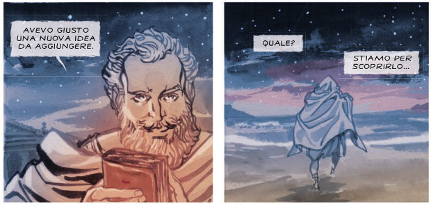 E vi compare per raccontare i contenuti e il ritrovamento del cosiddetto Codice C, o palinsesto di Archimede, di cui ci raccontano nell’interessante e dettagliato redazionale Roberto Natalini e Andrea Plazzi, fautori e prosecutori di questa opera meritoria che sta contribuendo a creare una cultura del fumetto scientifico in Italia.