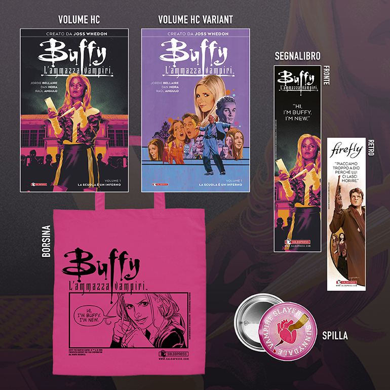 saldaPress ha deciso di celebrare il ritorno e rilancio di Buffy a fumetti in grande stile. Come? In due modi. Prima di tutto, omaggiando chiunque acquisterà il primo volume in fumetteria e nello shop online del sito saldaPress con ben tre omaggi: una shopper fucsia dedicata all’ammazzavampiri, un segnalibro fronte-retro che da un lato omaggia la nuova serie a fumetti Firefly (in arrivo sempre per saldaPress ad aprile) e con una spilletta imperdibile, con un cuore trafitto da un paletto.
