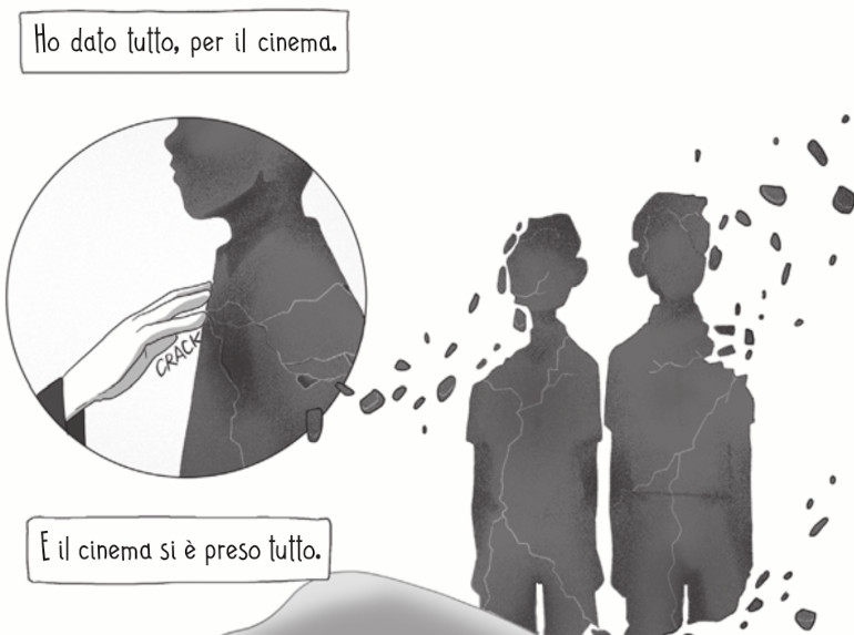 Altre volte invece le riquadrature sono lineari, quando raccontano pezzi di storia. E i personaggi sono spesso soli, con poco sfondo e pochi oggetti. Raramente è l’esterno a contare, molto più spesso sono le persone e la loro intimità. Tranne quando l’ambiente è importante, ad esempio l’applauso tributato a Keaton in occasione del Premio Oscar alla carriera. Molto più dettagliati sono gli ambienti mentali, quei sogni di cui Andrea Fontana parla nella postfazione, che erano nella mente instabile del protagonista e che sono venuti fuori nelle sue opere. Ma anche quando la realtà si trasfigura nel gioco della pellicola, anche lì i dettagli si arricchiscono.