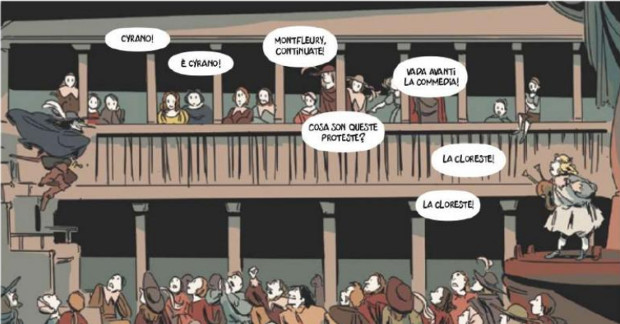 Genny Ferrari non modifica le battute e la scrittura in rima, più adatta al teatro. In effetti si tratta di un palcoscenico su carta: non a caso la collana di Kleiner Flug prende il nome di Teatro fra le nuvole. La storia è ambienta in una Francia che, nonostante sia in piena Guerra dei Trent’anni, ha colori pastello, frequenta i teatri e lascia spazio a difficili relazioni amorose. L’allestimento è realistico, ma poco sfarzoso. I personaggi caratterizzati con pochi tratti e una grafica piuttosto semplice.