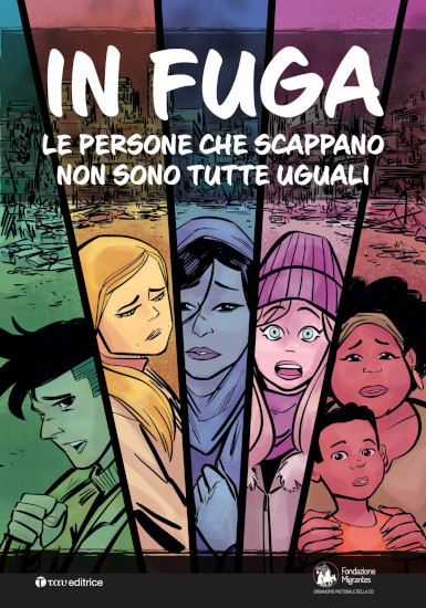 In fuga: Le persone che scappano non sono tutte uguali, il sottotitolo spiega bene il contenuto e l’approccio di questo albetto di 40 pagine, edito da Tau editrice con la collaborazione della Fondazione Migrantes, organismo ufficiale della Conferenza Episcopale Italiana che si occupa di migranti e migrazioni.