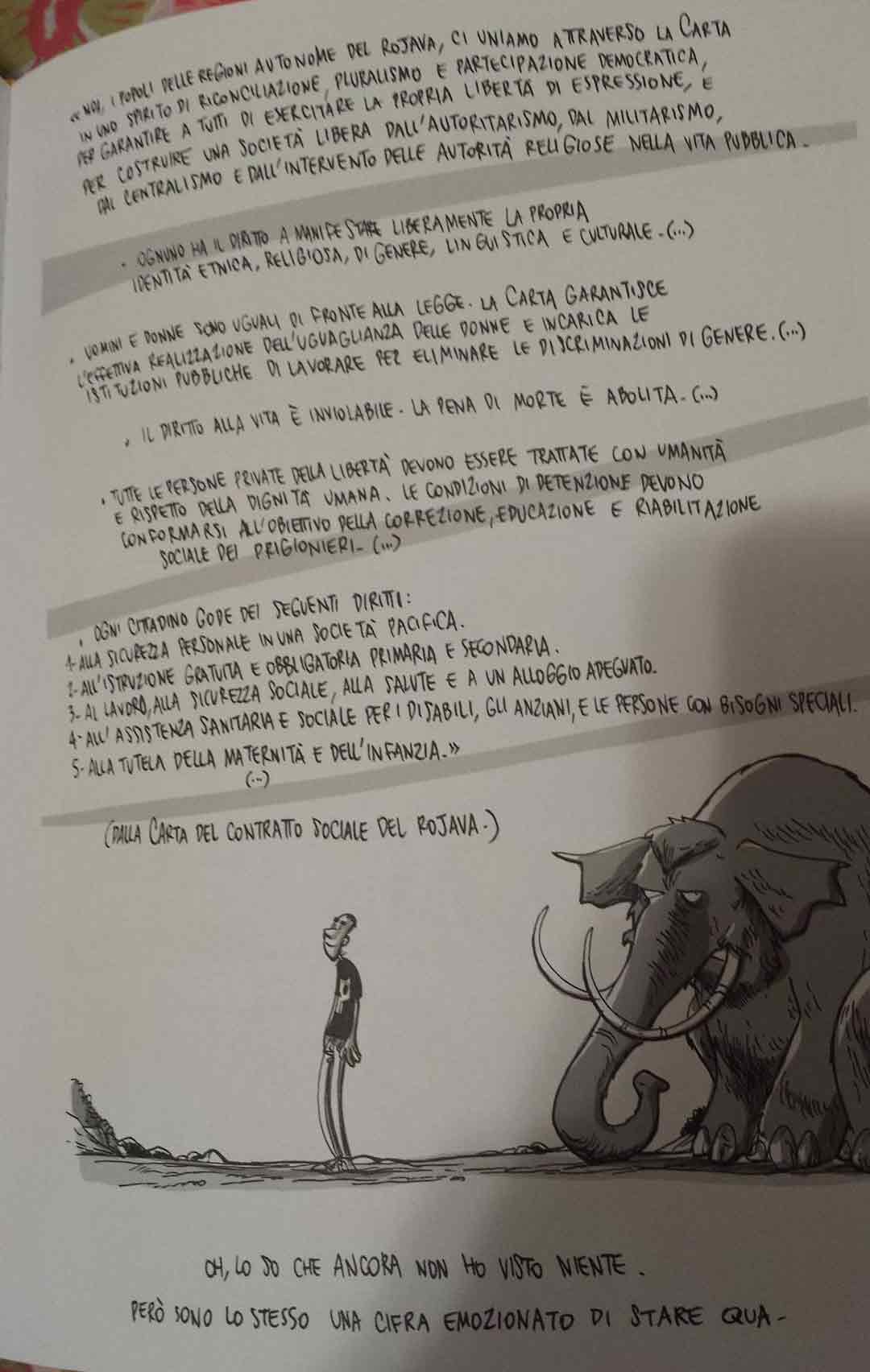 Per raccontare il Rojava e la guerra Zerocalcare si affida principalmente ai racconti e alle testimonianze di chi ha vissuto e vive in quei luoghi. Riportando diverse voci riesce a tracciare un quadro completo del popolo Curdo e dei conflitti che da anni devastano quella zona di mondo.