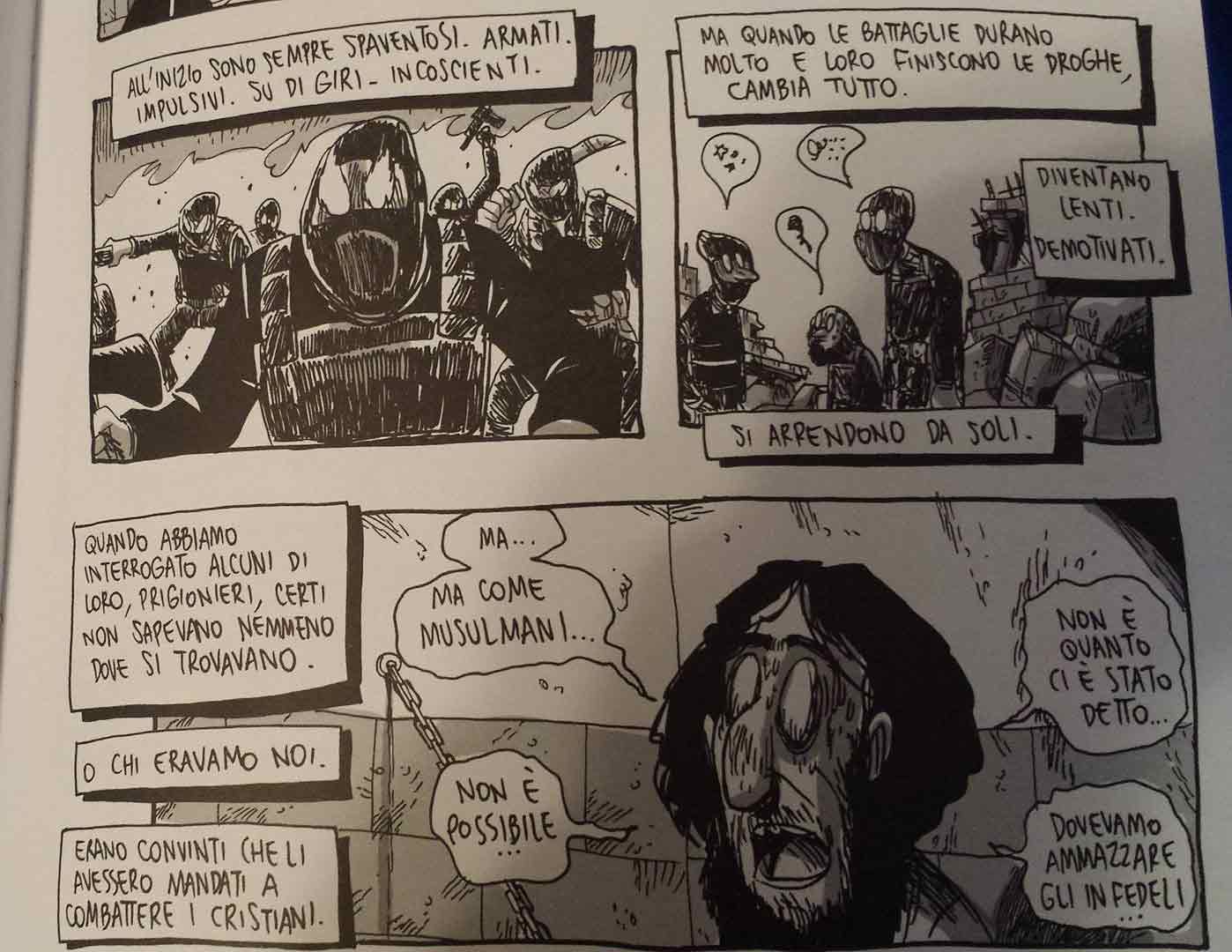 Per descrivere i miliziani Daesh, non avendo fonti dirette, ancora una volta Zerocalcare si affida ai racconti dei combattenti YPJ e YPG. I guerriglieri dell’ISIS provengono dalla Turchia e dall’Europa, nelle loro intenzioni combattono la cosiddetta “guerra agli infedeli”, non sapendo che tra le file di YPJ e YPG ci sono spesso dei musulmani. Disegnati come degli spiriti neri, i miliziani Daesh sono qualcosa che “c’è e non c’è”, una presenza impalpabile, l’essenze stessa del terrore. È una minaccia strisciante e invisibile pronta a colpire da un momento all’altro, e pronta a combattere centimetro per centimetro per conquistare i territori che i Curdi hanno ripreso con il sangue.