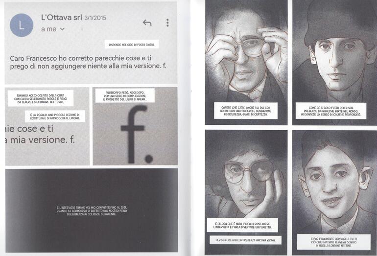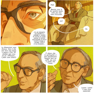 Anche a questo serve il diverso lettering usato nel volume: tutte le frasi che dovrebbero dirci qualcosa, siano esse di Battiato, di Camisasca, di Giuni Russo, di Uspenskij sono in corsivo, sono tutte vere e proprie citazioni.