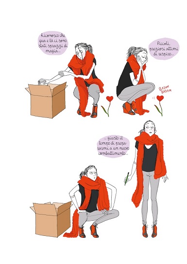 Infatti, è la prima cosa che colpisce: la mancanza di vignette e ballon rende benissimo l’idea di quello che può essere il monologo interiore della protagonista, che si ritrova a traslocare dopo una storia finita e a ricostruire il proprio reale disegnando fiori e arcobaleni insieme alla sua bambina.