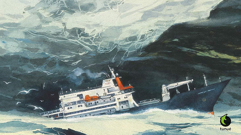 La matita di Lepage descrive un paesaggio aspro ma coinvolgente, la forza del mare, i cavalloni scuri, l’incredibile immenso cielo che li sovrasta.