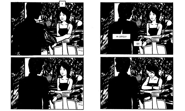 Le ragazze nello studio di Munari di Alessandro Baronciani è un racconto che se dovessimo rappresentare graficamente con una linea progressiva si risolverebbe in un grosso ghirigoro: il protagonista Fabio è un appassionato di libri, ha un negozio di libri usati, e scrive la sua storia attraverso il rapporto con tre ragazze diverse. Di lineare nel suo racconto non c’è nulla, i flashback o i ricordi seguono le sue sensazioni e gli stimoli che gli provengono da un oggetto o da una riflessione.