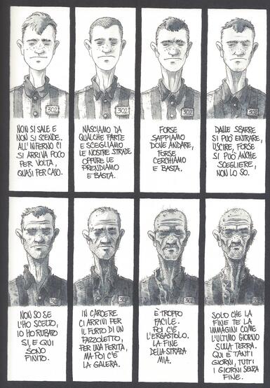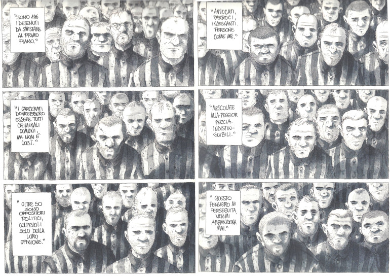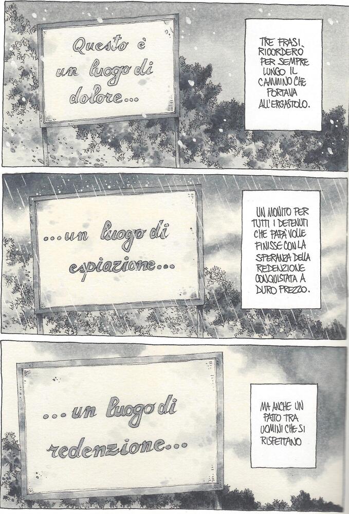 La struttura del fumetto ricorda un’altra opera che ho molto apprezzato, anche se di natura completamente diversa, quell’Ossario di Lorenzo Palloni già recensito su queste pagine: un collage di storie diverse, raccontate con toni diversi, con un minimo comune denominatore, che in questo caso non è solo il luogo, ma è anche la solitudine, il tempo, la prigionia.