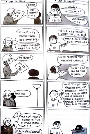 La regolarità delle gabbie (sempre con 6 vignette identiche, su tre righe) viene appena scalfita da alcune tavole a cinque vignette. Se il libro parla di matematica, è anche giusto che il fumetto sia parimenti regolare.