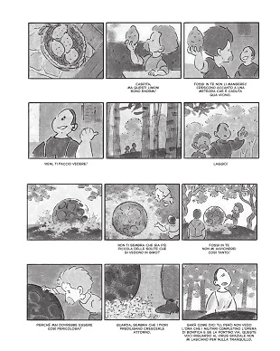 Leggendo questo primo tentativo di graphic novel (arriviamo alle definizioni) ti viene voglia, infatti, di dare un nome alla forma di quello che hai appena goduto, per poterla meglio afferrare: quella che è venuta a me è “retro-fumetto”, perché se esistono i retrogame ben vengano anche le strisce. Ma quest’opera non ha gli stilemi tipici del genere: non ha i ballon, non ci sono, per questo è stato definito da altri come fumetto-storyboard (che mi sembra riduttivo e troppo prosaico) perché al di sotto di una griglia rigidissima di dodici vignette per tavola, tutte della stessa grandezza, ci sono le didascalie che coprono sia la spiegazione della voce narrante (in stampatello minuscolo) sia i dialoghi tra i personaggi (stampatello maiuscolo). Inoltre se si prova ad immaginare al di sotto e al di sopra dei disegni la classica texture con i forellini della vecchia pellicola fotografica, ecco che il tutto si trasforma in una sequenza di film… come si può racchiude tutto questo in una definizione? Non si può, quindi continueremo a chiamarlo fumetto, o Nona Arte, che non sbagliamo.