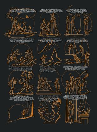 Il registro grafico cambia solo quando si racconta di Orfeo, nei colori e nei modi, nel mostrare all’inizio l’interno del mantello del cantastorie, con le dodici vignette disegnate in ocra su sfondo nero. Soprattutto nell’organizzazione delle pagine, quando viene riportata nell’albo la rappresentazione del melodramma.