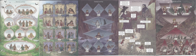 Queste pagine non modificano sostanzialmente lo stile grafico e dei colori, anche se la pagina corrispondente al primo atto è quella con i colori più chiari dell’intero albo. Pur mantenendo l’ordine delle quattro righe, la forma e l’organizzazione delle vignette diventa del tutto particolare.
