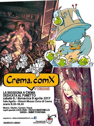 Dopo il successo della prima edizione, torna Crema.comX, la rassegna del Fumetto a Crema. 8 e 9 aprile 2017, Sale Agello e chiostri del Museo Cremasco. Due giorni dedicati all’arte del Fumetto, con ospiti Paolo Martinello, Luca Usai, Sakka, Jimmy Fontana e il suo Collettivo Gatacornia. Sketch, stand, spazio games, cosplayers, eventi, contest, mostre. Organizzazione: Crema.comX, Instabile Quick, Centro Fumetto “Andrea Pazienza”.